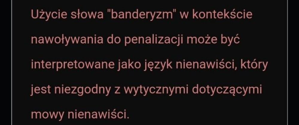 Warto doprecyzować, że jak wynika z dołączonego do wpisu dziennikarza zrzutu ekranu, nie tyle samo użycie słowa banderyzm jako takiego jest uznawane za "mowę nienawiści", ale jego użycie w konkretnym kontekście - nawoływania do penalizacji.