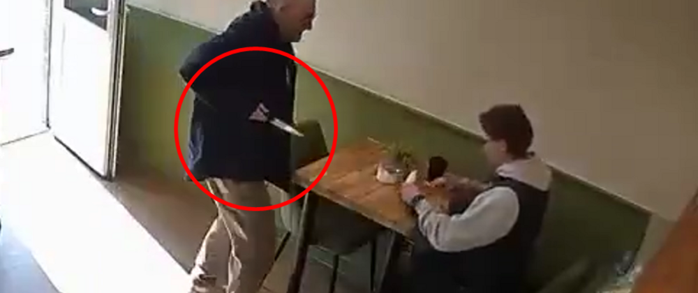 Na nagraniu z monitoringu widzimy mężczyznę siedzącego przy stoliku. Nagle do lokalu wchodzi człowiek z nożem i zaczyna atakować klienta. Ten jednak zrywa się i walczy z napastnikiem. W tle słychać przerażone krzyki obsługi.