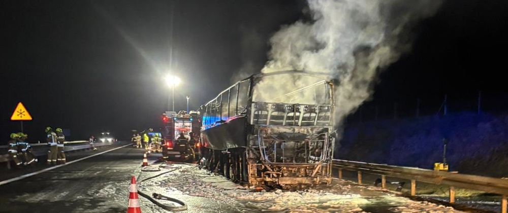 Jak podaje straż pożarna, zdarzenie miało miejsce w nocy 10.03.2026 r. o godzinie 1:25. Ogień pojawił się w autokarze rejsowym - najprawdopodobniej firmy Filxbus - który jechał z Białegostoku.